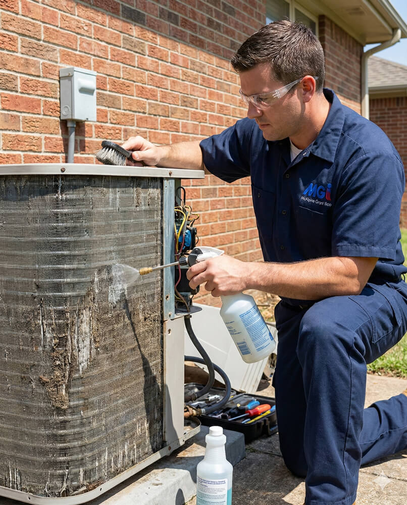 - Coil cleaning. Deep cleaning of both evaporator and condenser coils to remove dust and grime that reduce cooling power.